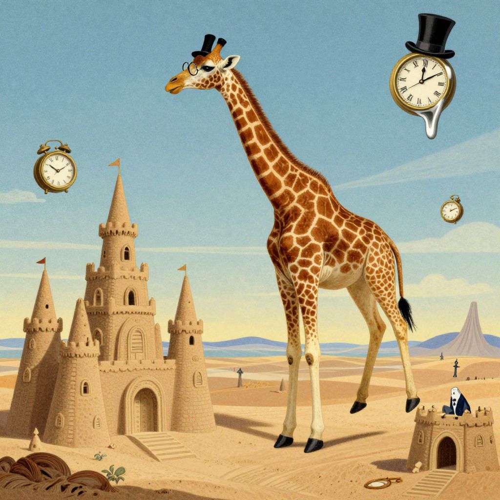 Craft an alluring image that intertwines the magical realms of cherished children's literature with the surreal ambiance of Dali-esque dreamscape, depicting a stately giraffe adorned in a top hat and monocle gracefully levitating above a vast desert terrain embellished with colossal sandcastles fashioned after iconic fairy tale edifices. This captivating scene should be rendered in the nostalgic style of vintage children's book illustrations, subtly incorporating elements reminiscent of melting clocks and floating objects to evoke a sense of whimsical wonder, inviting viewers to embark on an extraordinary voyage through time and imagination as they marvel at the delightful fusion of nature and fantasy.