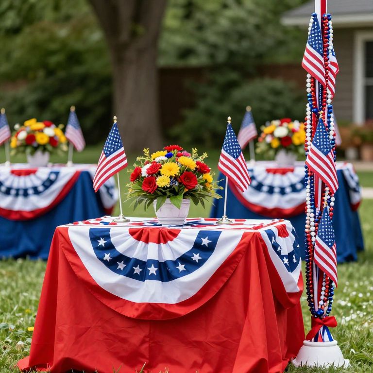 Patriotic outdoor tables draped in vibrant red, white, and blue fabric are adorned with colorful flower arrangements and American flags, complemented by a tall decorative pillar filled with patriotic beads, creating a festive 4th of July display.
