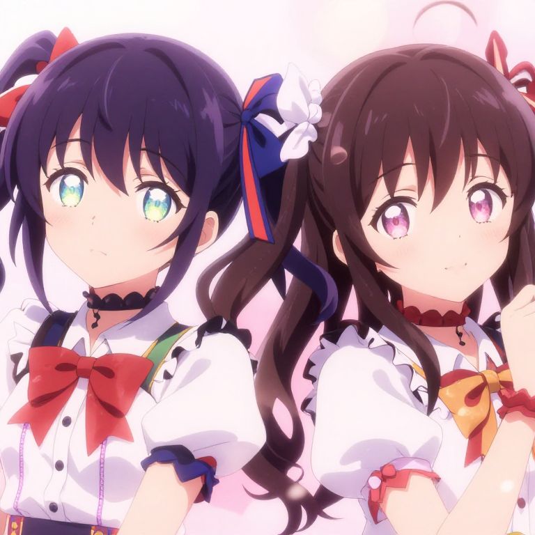 This vibrant digital anime-style illustration features two young girls with large, expressive eyes, set against a plain white background. The girl on the left has dark blue hair in twin ponytails, adorned with red and blue ribbons, and green eyes. She wears a white blouse with a red bow and a black choker. The girl on the right has long, dark brown hair with pink eyes, a red ribbon, and a yellow bow. Both girls have similar white blouses with puffed sleeves and black trim. The artwork is characterized by bright colors, clean lines, and a soft, pastel-like shading style.