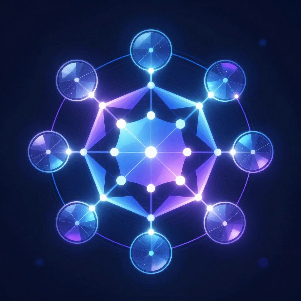 Gestor as an abstract concept, visualized with glowing geometric shapes and interconnected nodes representing management and organization, vibrant color palette of blues and purples, digital art style with fluid gradients and dynamic energy, conveying intelligence and strategic thinking