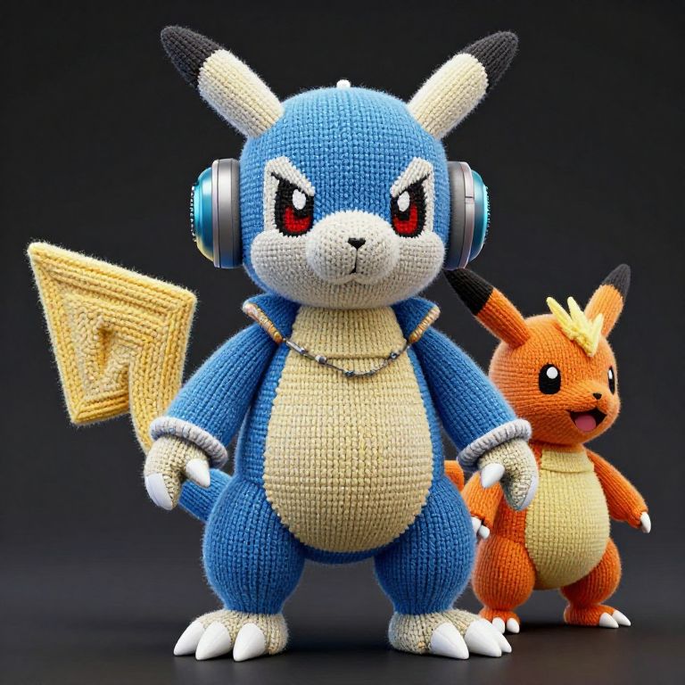 Photograph of two knitted Pokémon characters against a dark background. The front character is a blue and white, bear-like creature with red eyes, wearing large blue headphones, and has a yellow triangular tail. Its expression is stern. The smaller character behind is an orange, mouse-like Pokémon with a yellow belly, small black ears, and a red cheek patch, looking cheerful. Both characters have textured, crocheted appearances, with the blue character's arms crossed. The dark background contrasts with their bright colors, highlighting their detailed, textured knitted surfaces.