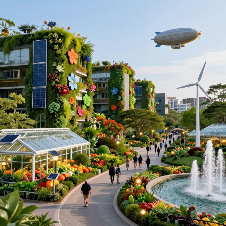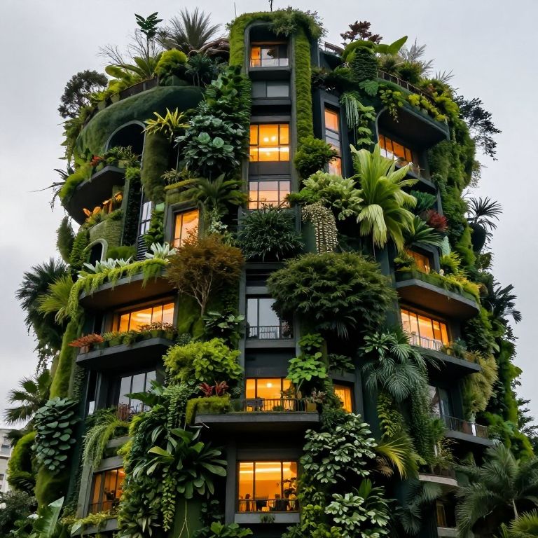 Vertical gardens ascend toward the heavens, their spiraling forms a testament to humanity’s quest for harmony with nature, while the warm glow within each window whispers stories of life, growth, and the enduring spirit of connection.