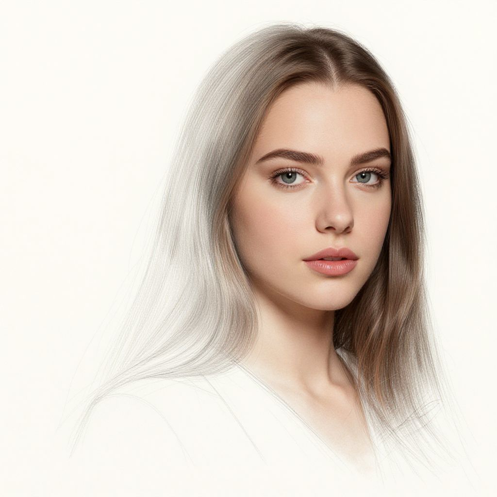 Sketch to image transition, rough hand-drawn outlines morphing into photorealistic portrait, fine shading merging with lifelike skin tones and detailed features, artistic metamorphosis from paper to digital art, elegant and inspiring visual narrative