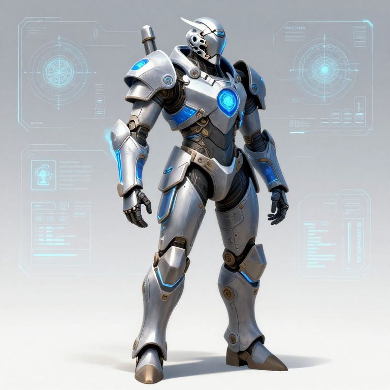 Digital artwork of a futuristic, silver and blue humanoid robot with glowing blue accents, standing against a white background with glowing blue technical diagrams.
