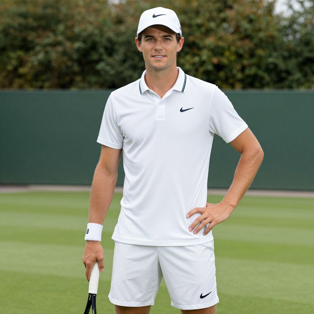 Photograph of a young male tennis player standing on a grass court. He has a fair skin tone, short dark hair, and is wearing a white Nike polo shirt with black accents, white shorts, a white cap, and a white wristband. He holds a tennis racket in his right hand and rests his left hand on his hip. The background features a dark green fence and a dense, green bush. The player is smiling slightly, exuding a confident and approachable demeanor. The image has a slight digital enhancement effect.