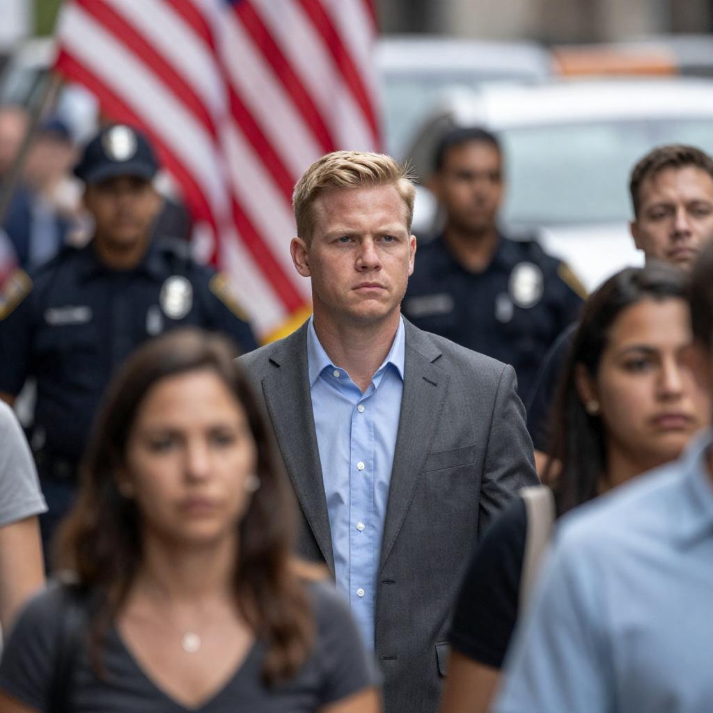 Photograph of crowded street scene. Foreground: blonde man in gray suit, blue shirt, serious expression; brown-haired woman in gray top, deep expression. Background: American flags, police officer, multiple people, blurred faces. Casual, urban setting.