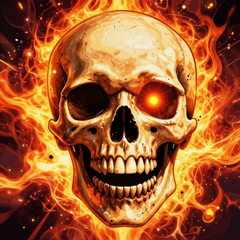 A vibrant, chaotic skull with a wide, maniacal grin, glowing eyes, and sharp teeth, surrounded by a fiery, explosive background.