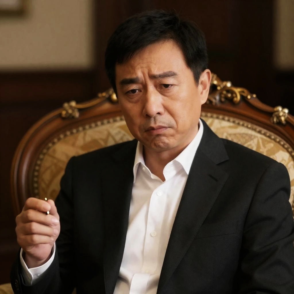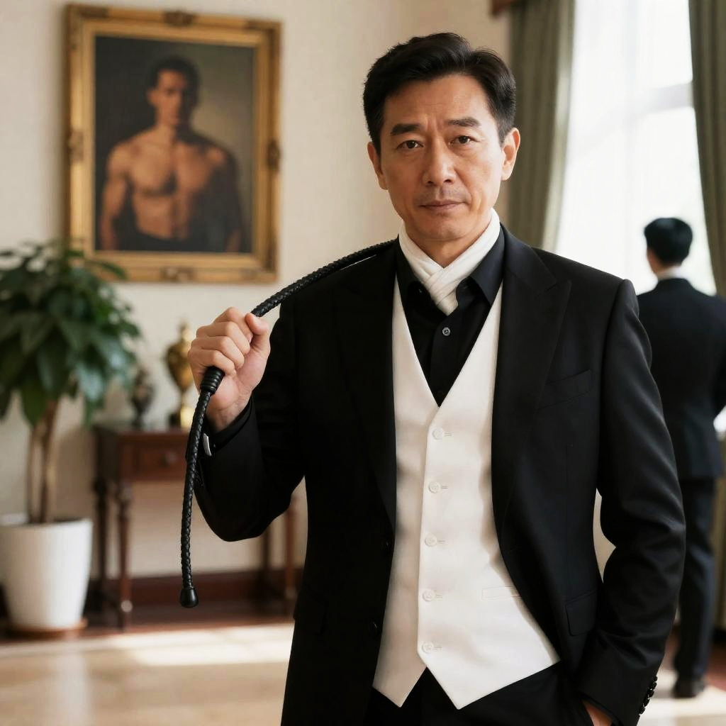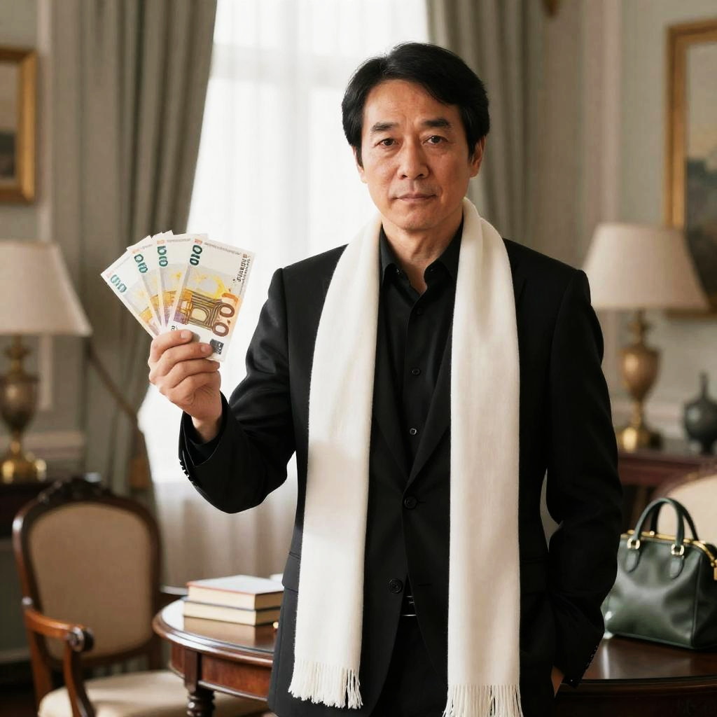 Middle-aged Asian man with black hair, wearing a black suit, white scarf, and black shirt, holding two stacks of euros in his right hand. He stands in an elegantly decorated room with sunlight streaming through curtains. Wooden chair and table with books and a lamp in the background. His expression is neutral. A green bag is on the table.