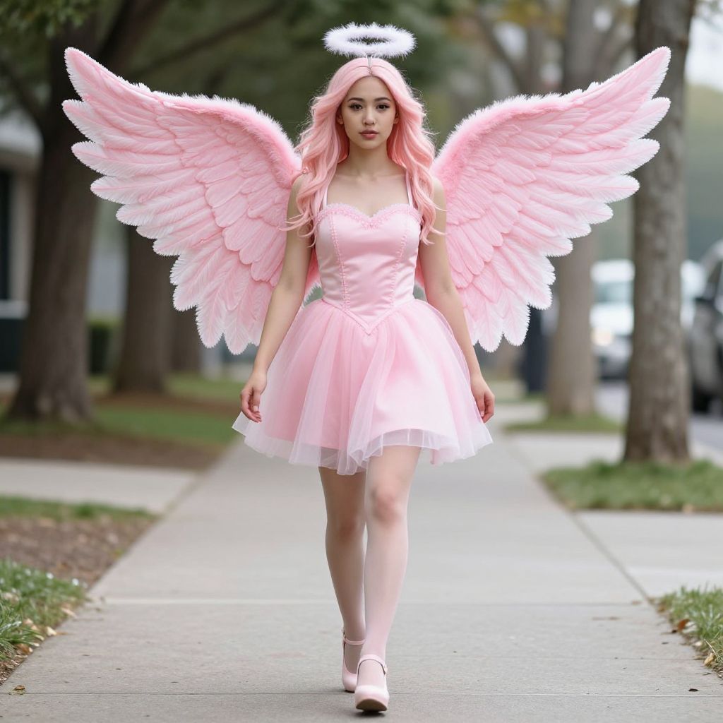 Photograph of a young woman with long pink hair and fair skin, walking down a suburban sidewalk. She wears a pink, strapless, tulle angel dress, with large, feathery pink wings extending from her back, and white ankle socks. A white halo floats above her head. The background includes tall trees, a blurred green lawn, and parked cars. The image has a surreal, fantasy style with vibrant colors and soft textures, emphasizing her angelic appearance. The sidewalk is gray and slightly worn.