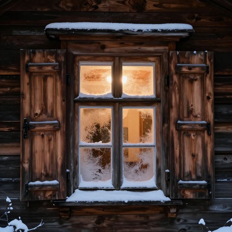 Shutter of a rustic wooden window in a cozy cabin surrounded by snow, frosted glass panes reflecting warm interior light, detailed wood grain, atmospheric winter mood, soft shadows, inviting and nostalgic ambiance.