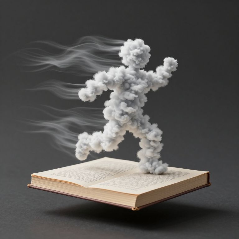 Digital artwork of a cloud-like, white, humanoid figure emerging from an open book against a dark background, with wispy smoke trails.