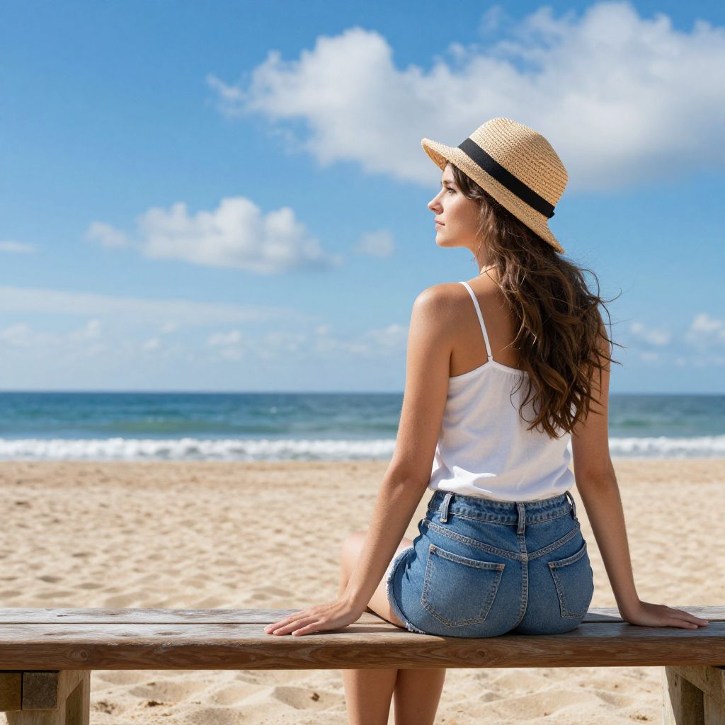 Contemplative woman seated on a wooden bench by the beach, wearing a straw hat and denim shorts, gazing thoughtfully toward the ocean under a vibrant blue sky dotted with fluffy clouds.