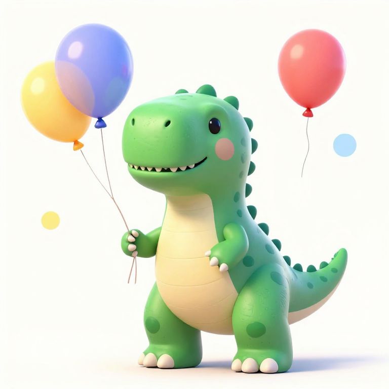 3D rendered image of a cute green cartoon dinosaur holding three colorful balloons (orange, purple, red) on a white background. The dinosaur has a chibi-style design with bright colors, large eyes, and a small smile, featuring a light beige belly and green spots along its back and tail. The image has a playful, party-themed vibe with a highly detailed and smooth digital art style.