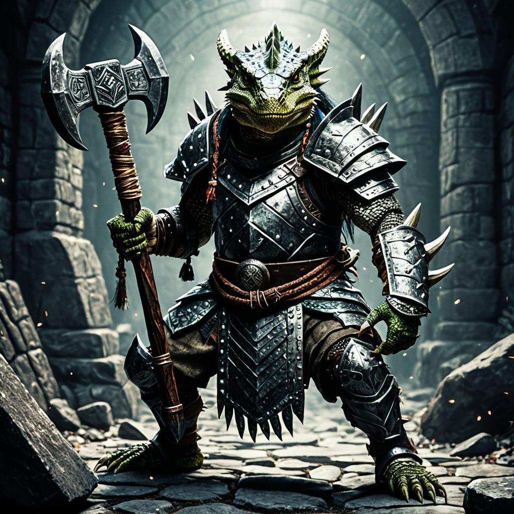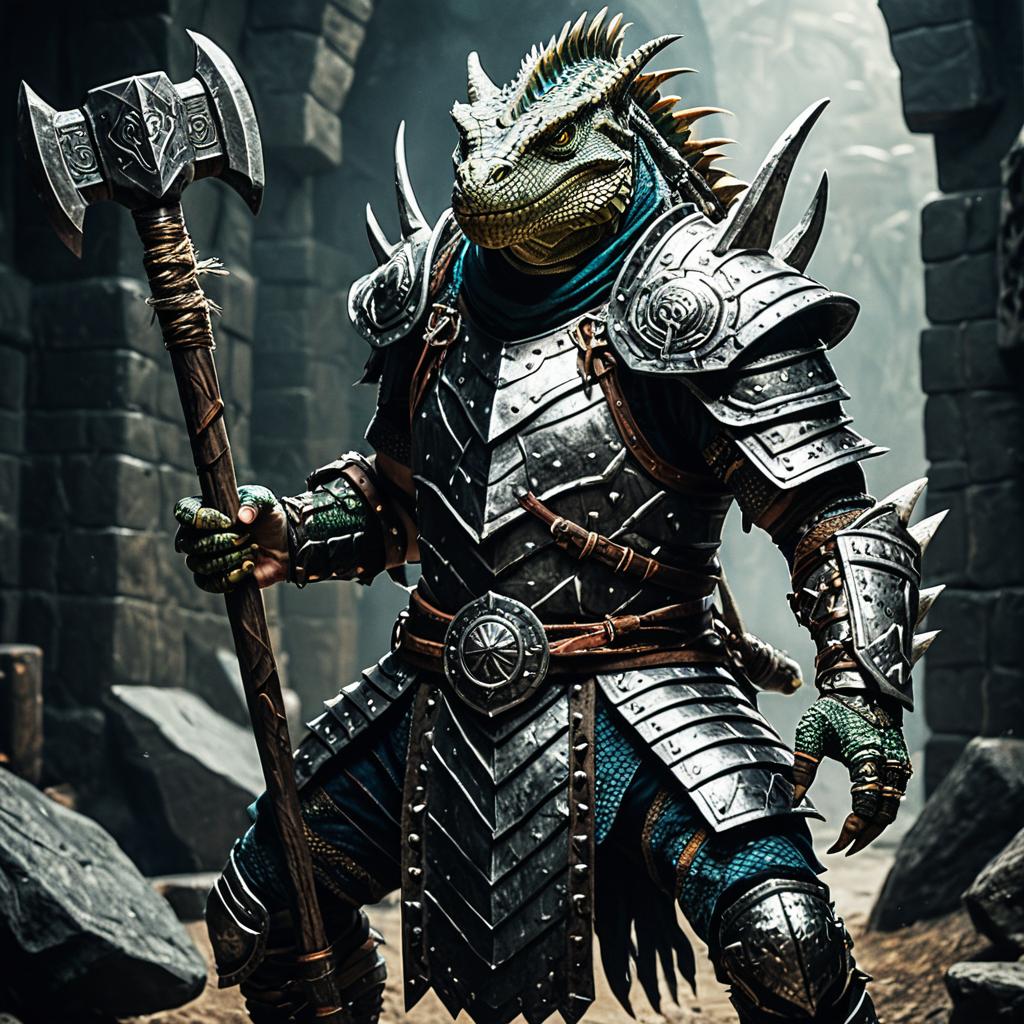 A detailed fantasy illustration of a full-body lizardfolk shaman wearing intricately designed metal armor with spiked shoulder pads. The lizardlike warrior holds a large, ornate hammer and stands in a dungeon-like stone environment. The character exhibits a dumbfounded expression, reminiscent of Dungeons & Dragons style art.