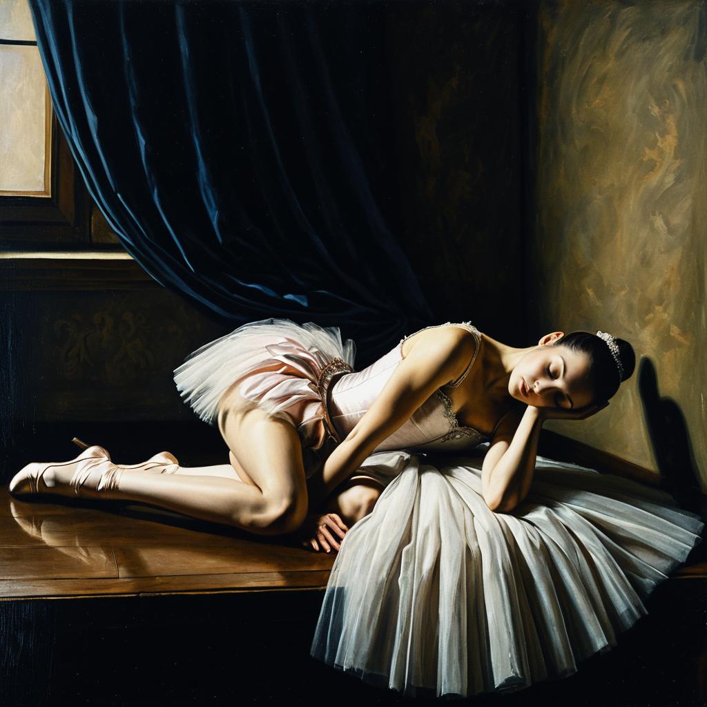A painting of a ballerina resting backstage in Renaissance style, featuring dramatic lighting, rich textures, and elegant grace, realistic yet expressive with a touch of surrealism