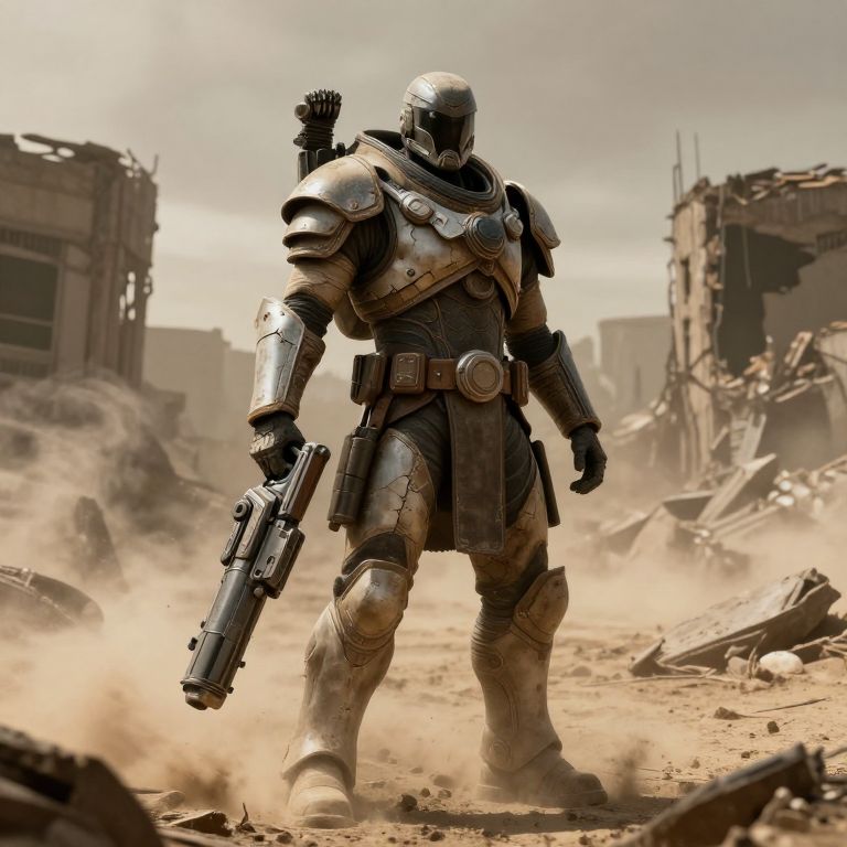 Photorealistic CGI image of a heavily armored, futuristic soldier standing in a dusty, war-torn cityscape. The soldier wears silver, plated armor with a high collar, holding a large, black handgun in his right hand. A quiver of arrows is strapped to his back. The background features crumbling, ruined buildings with debris scattered around, under a cloudy, overcast sky. The soldier's helmet has a reflective visor, obscuring his face. The overall color palette is muted, dominated by browns and grays, with a focus on the metallic sheen of the armor.