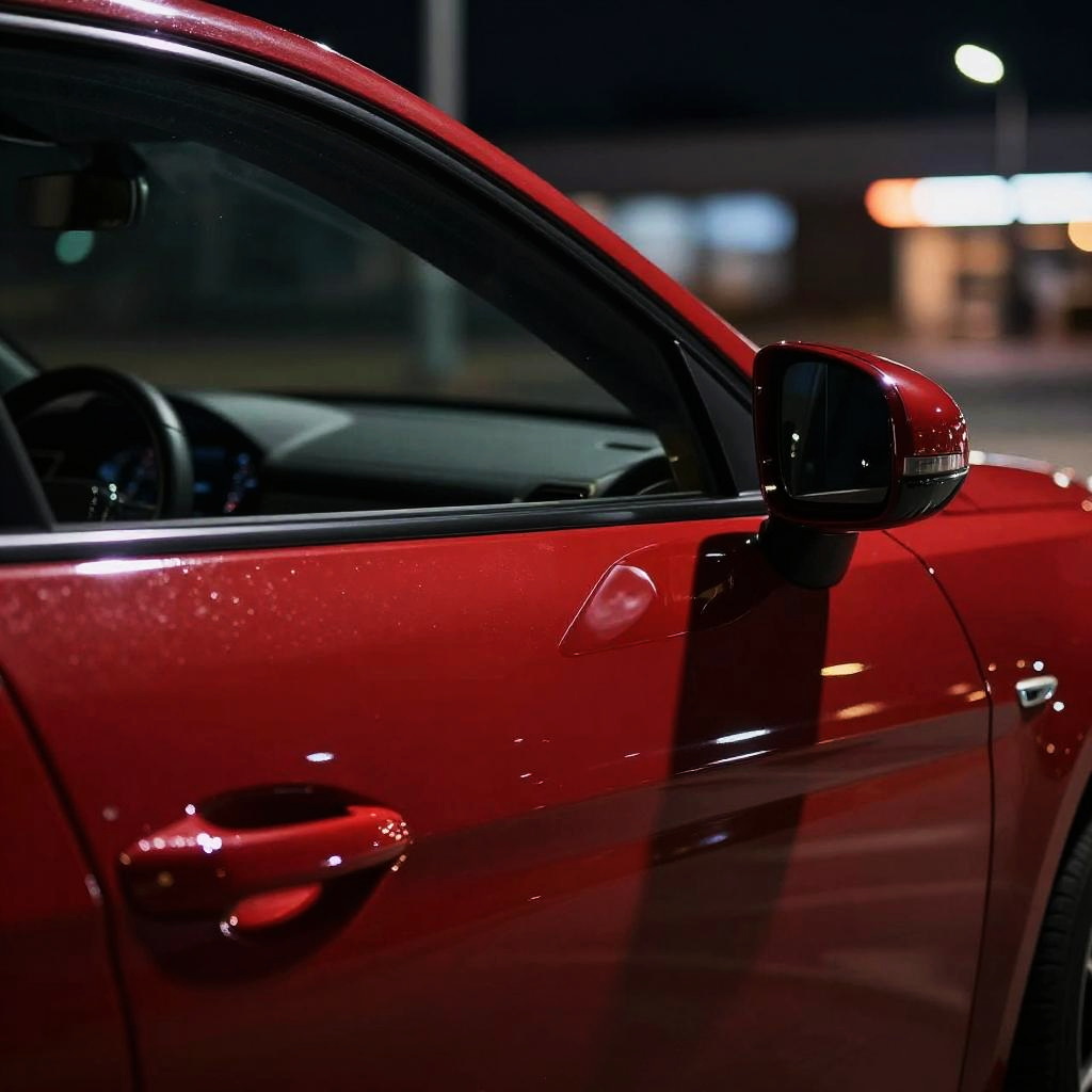 Laccato finish on a sleek modern car, glossy deep red paint reflecting city lights at night, ultra-detailed close-up showing smooth curves and high gloss shine, cinematic lighting, realistic texture, hyperrealism.