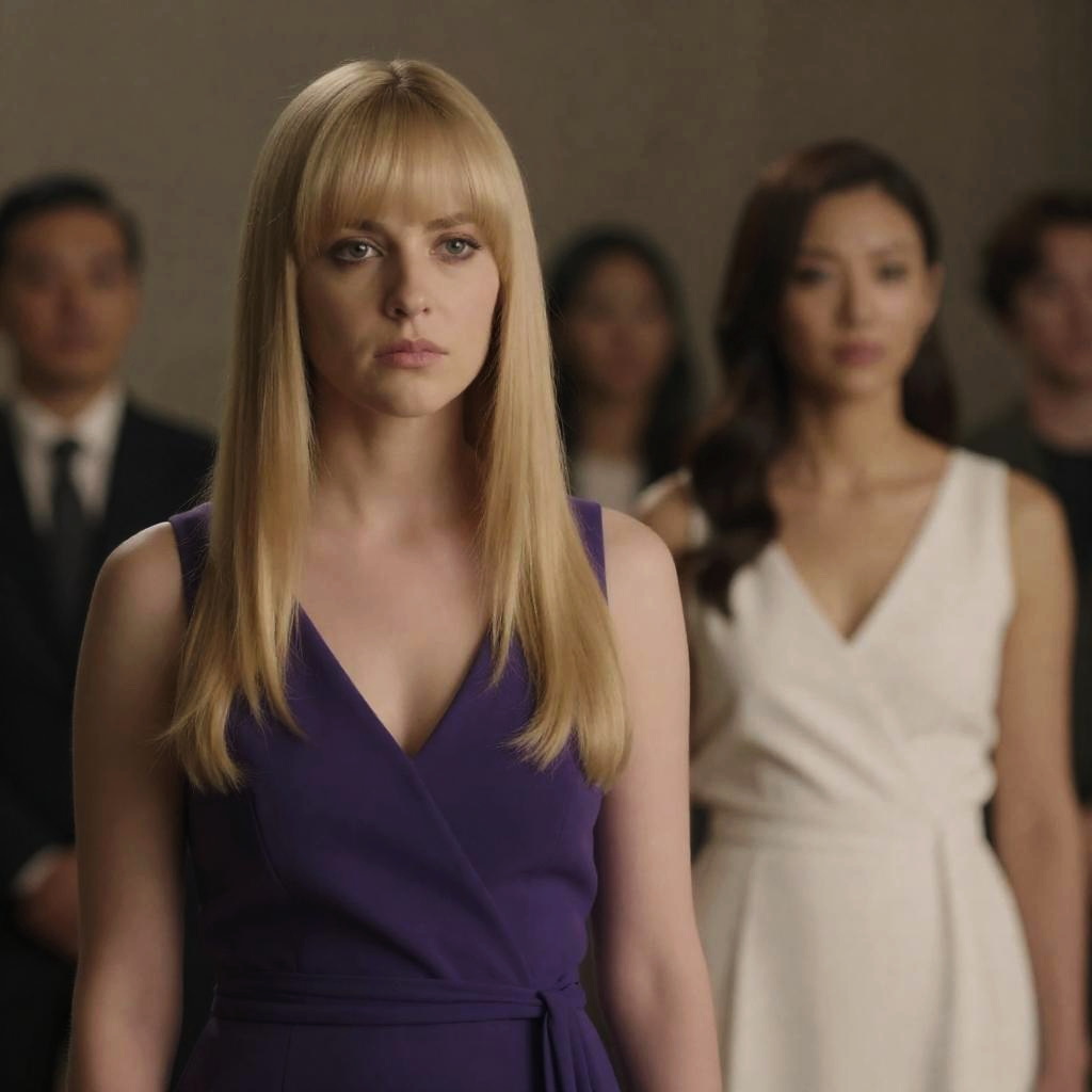 Photograph of a blonde woman with straight hair and bangs, wearing a red dress with a low neckline and a pearl necklace. She has light skin and a neutral expression. She is indoors, standing near a floral-patterned curtain and a plant with red flowers. The lighting is dim, highlighting her upper body and face.