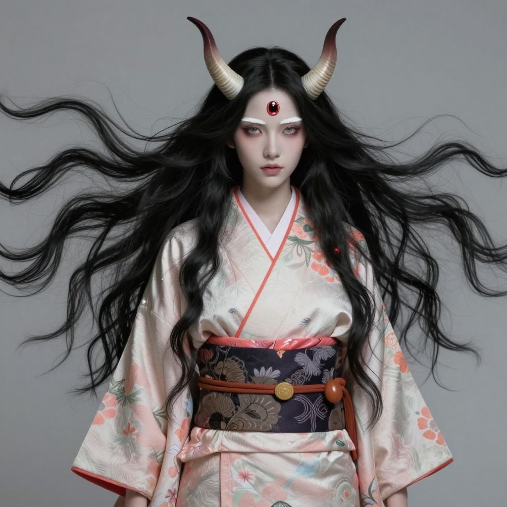 Digital anime-style illustration of a beautiful Asian woman with long black hair, red horns, and a white floral kimono, set against a red circular backdrop