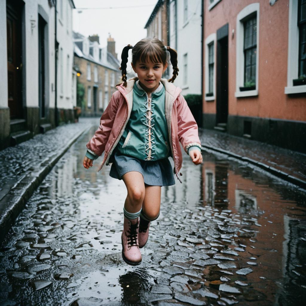 Kodak Portra cinematic film still of a little girl with freckles and pigtails, wearing a pastel jacket and lace-up boots, jumping through puddles on a rainy cobblestone street, moody and atmospheric vibe.