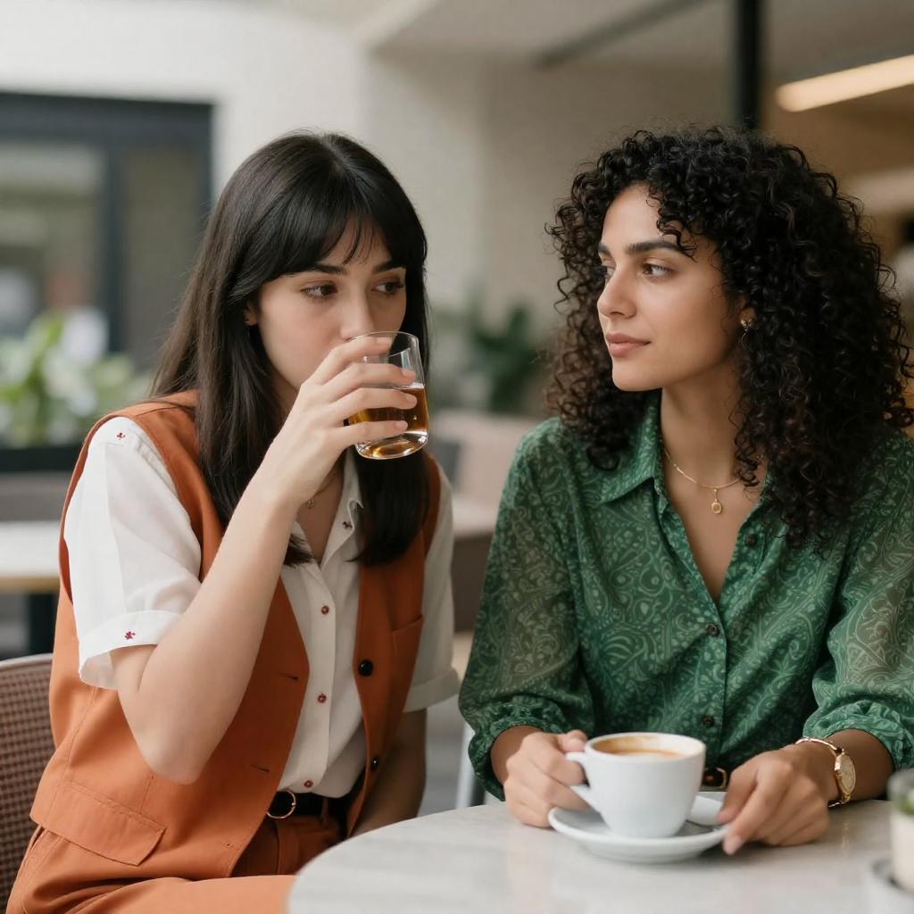 Photograph of three people in a casual café. A man in a white shirt sits left, smiling. A woman in a white tank top sits center, drinking from a glass. A man in a red tank top sits right, smiling. A server in a white shirt stands behind them. A table holds bowls, a red vase with an orange flower, and a coffee cup. A floral painting hangs on the beige wall in the background.