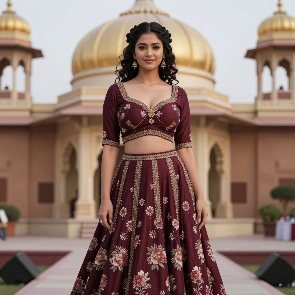 An elegant young woman with porcelain skin, curly black hair styled in delicate buns, and a warm, confident expression wearing a stunning maroon floral lehenga costume as part of a cultural pageant, standing in front of a grand courtyard with a golden dome and traditional Indian architecture in the background.. The woman has big breasts and cute face