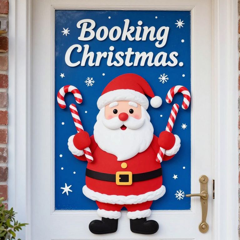 Brightly decorated Christmas door featuring a cheerful Santa Claus figure holding two candy cane-themed countdown strips, set against a festive blue background with stars and the text \"Booking Christmas.\