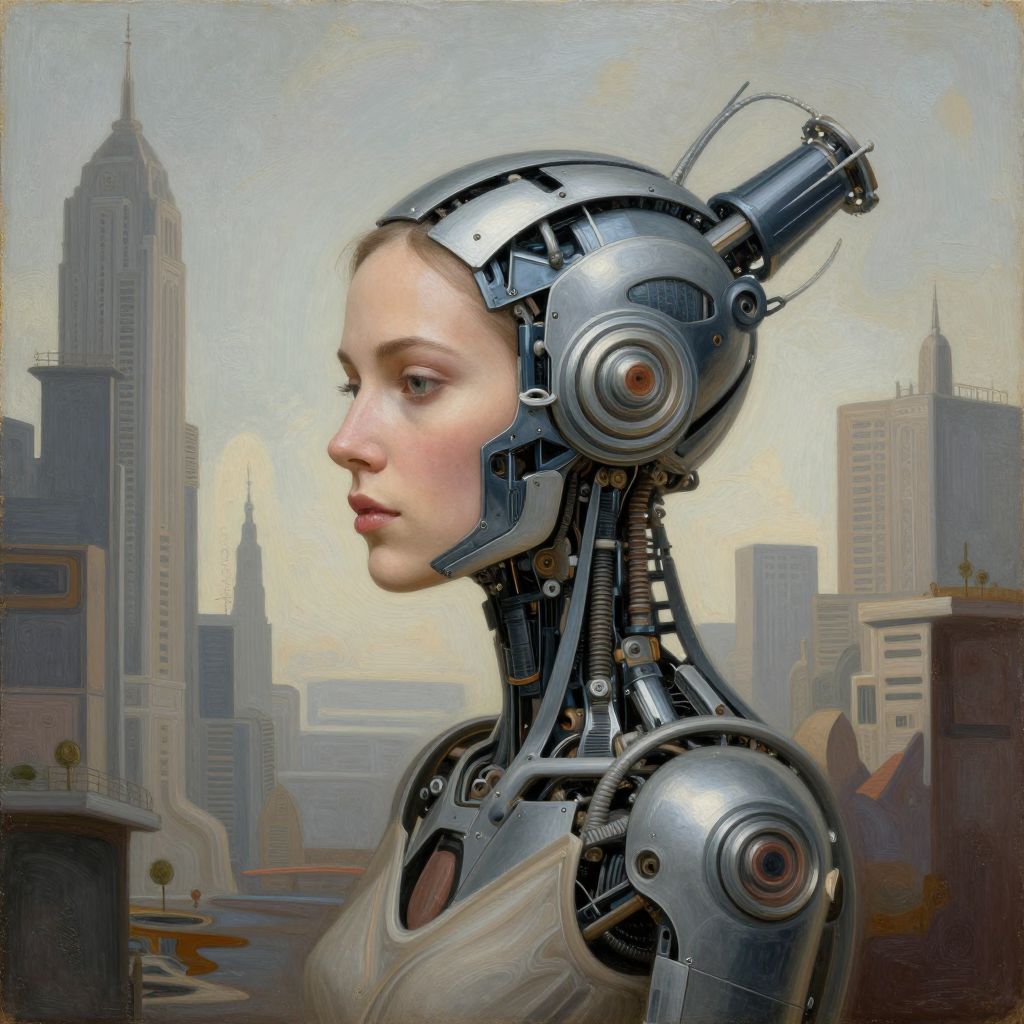 Digital painting of a cybernetic woman with a robotic head and neck, pale skin, profile view, set against a cityscape background.