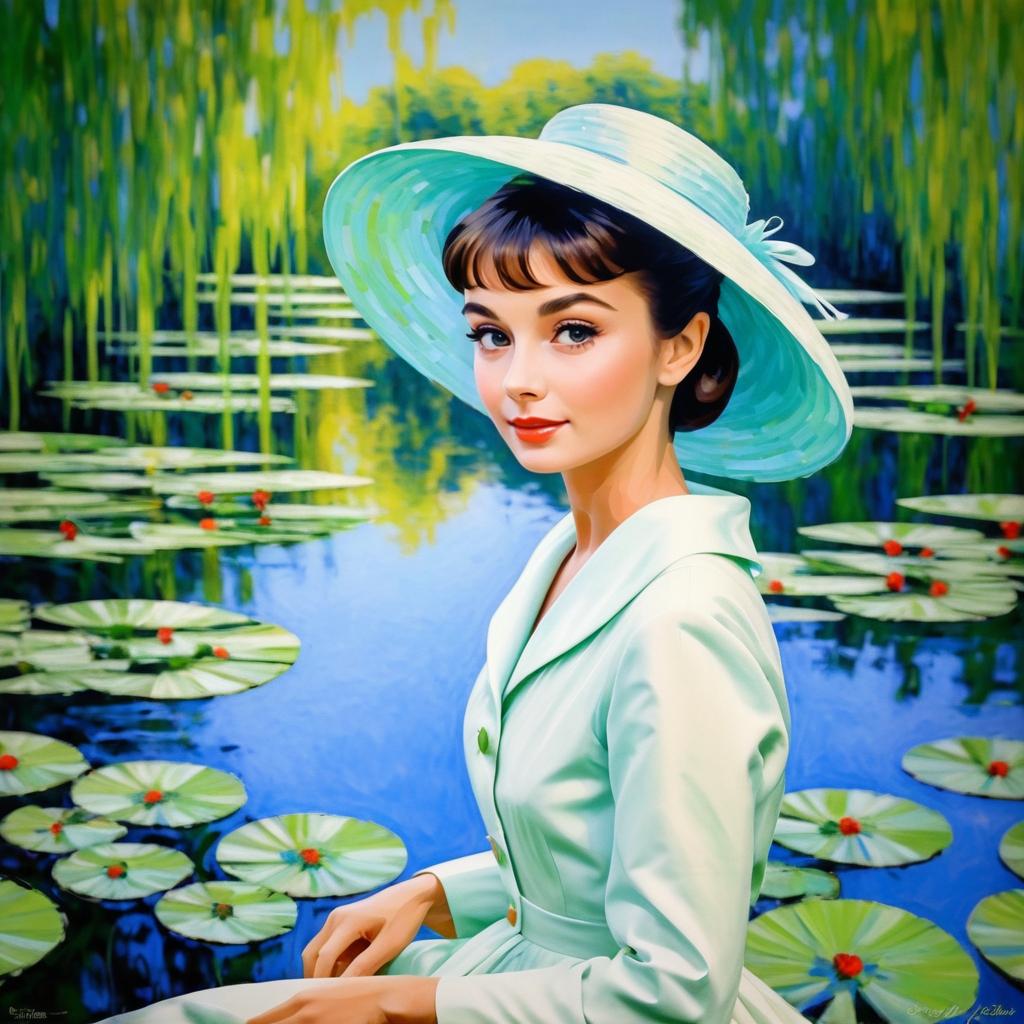 Young woman wearing a white dress and a wide-brimmed hat standing near a calm lake surrounded by lush greenery and blooming flowers under a clear blue sky.