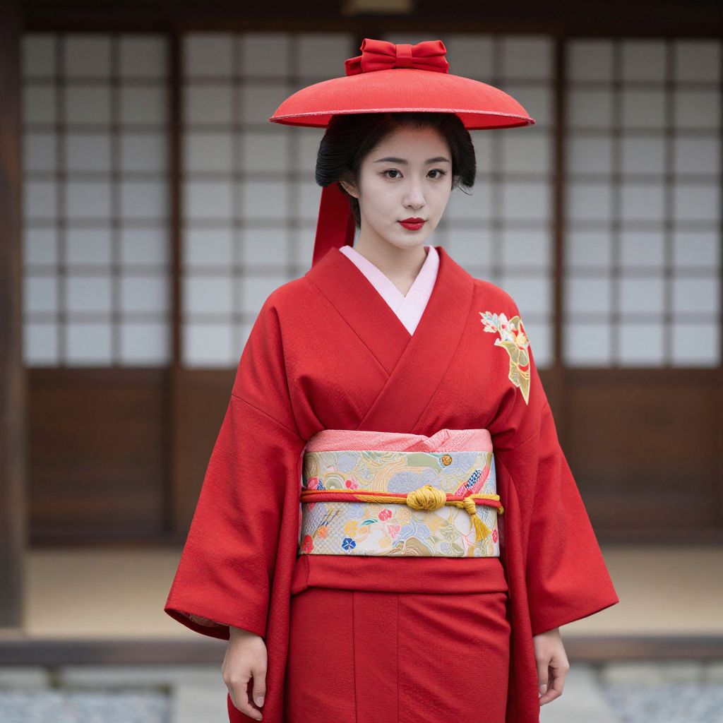 Photograph of an Asian woman in a vibrant red kimono with white trim, floral obi, and red hat, standing in front of traditional Japanese