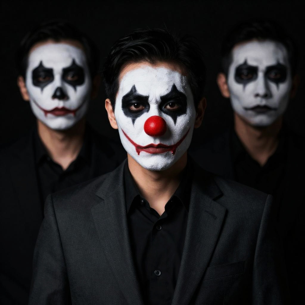 Purge Halloween Men, man with a white face and a black face and a red nose