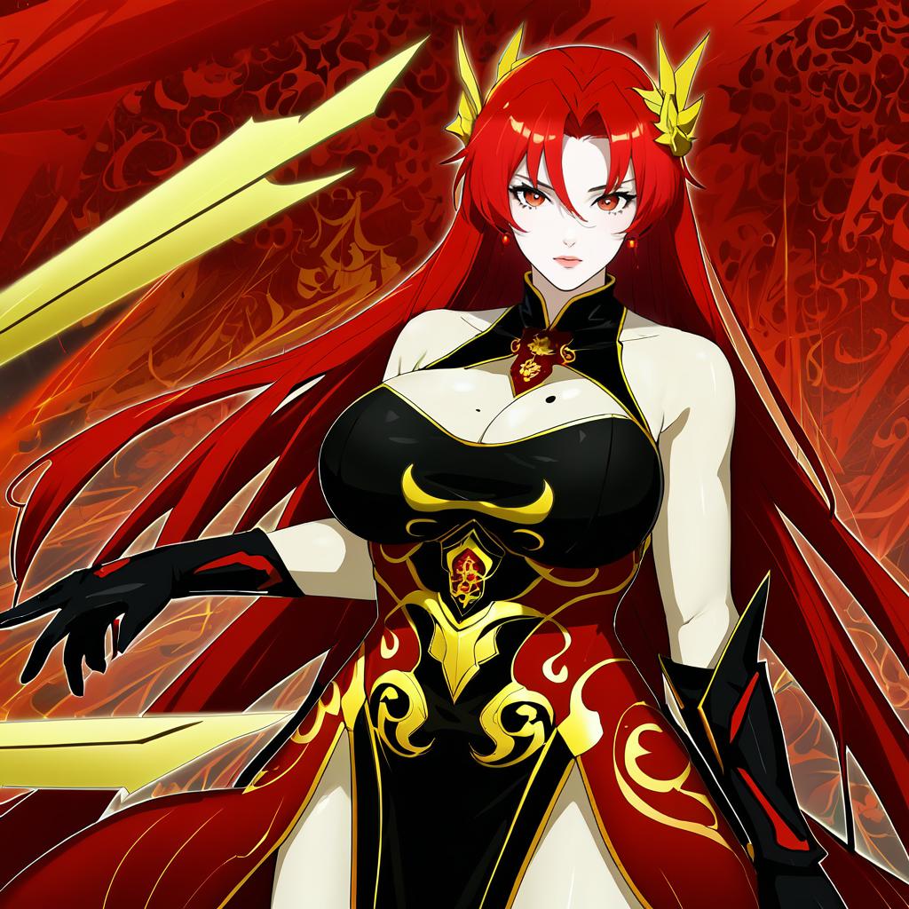 Anime-style illustration of a female warrior with long red hair and yellow eyes, wearing a detailed black and red armored leotard with gold accents. She has a mole on her breast and wears a traditional Chinese-inspired dress with intricate patterns, black gloves, and golden hair ornaments. The background features a vivid fiery red design, emphasizing a powerful and intense atmosphere.