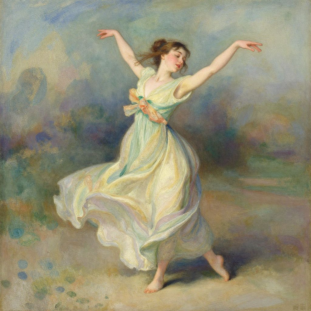 Impressionist painting of a graceful woman in a flowing, pale yellow dress, arms raised, dancing against a blurred, colorful background.