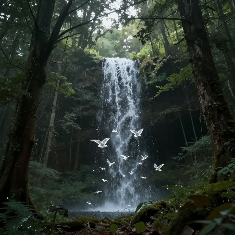 Photograph of a lush forest with a tall, cascading waterfall. White birds are mid-flight near the water's edge, surrounded by dark green trees