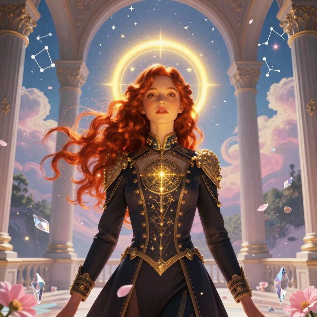 Surreal, vibrant portrait of lyra, an elegant figure with flowing copper-red hair and warm honey-colored glowing skin, set within a vast hall of mirrors reflecting swirling pastel skies and floating crystal petals. They wear an ornate dark uniform with gold accents and arcane sigils; a radiant yellow halo crowns their head as stars scatter across a cobalt sky. Pink flowers drift among constellations, luminous hues, dreamy atmosphere, rococo-infused science fantasy blending soft pastel tones with fine ornamental details.