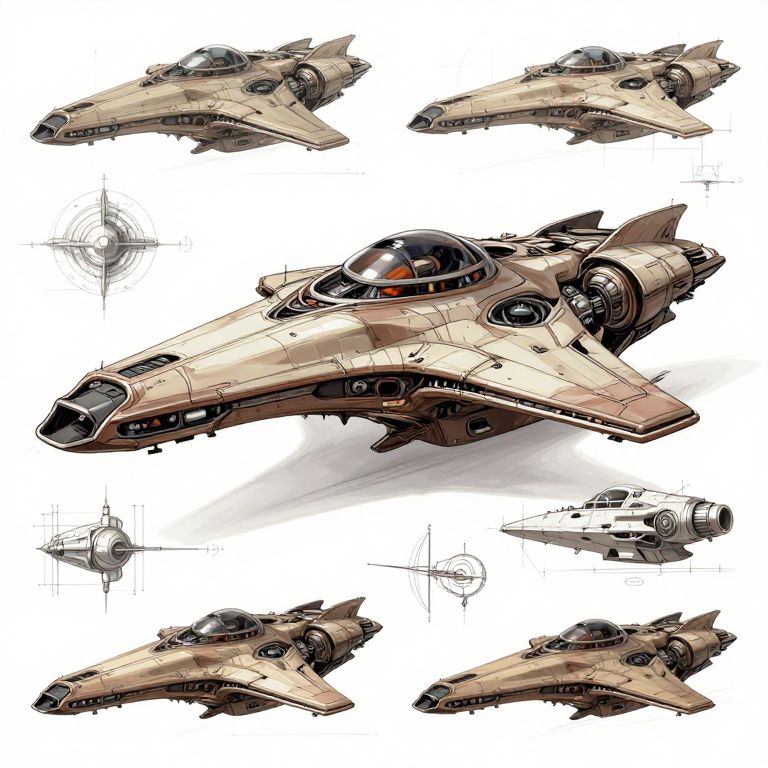 The image is a detailed concept art sheet featuring a medival starship, showcasing various sketches and perspectives of the futuristic vessel. The starship is depicted in a sleek, aerodynamic design with a prominent, curved hull and a large, central engine. The sketches include close-up views of the ship's intricate mechanical components, such as the engine and propulsion system, as well as different angles and perspectives to highlight its structure. The color palette is primarily shades of brown and beige, with subtle highlights and shadows that give depth and dimension to the drawings. The overall composition is well-organized, with the main ship in the center and smaller sketches surrounding it, providing a comprehensive view of the design. The detailed annotations and measurements suggest a meticulous approach to the concept art, ensuring that every aspect of the starship is meticulously planned and executed.