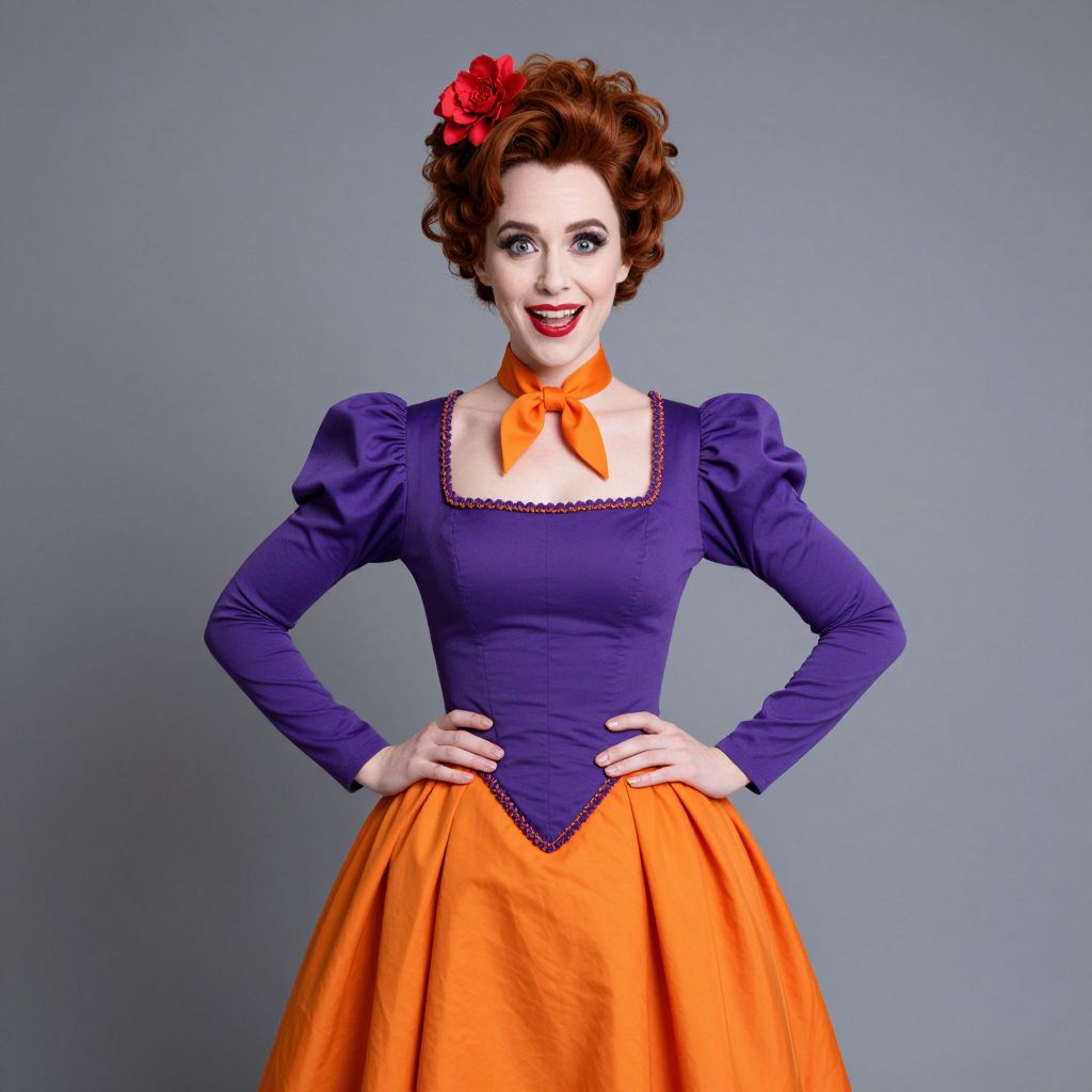 Vintage-inspired photograph of a fair-skinned woman with red curls, wearing a blue bodice, orange skirt, orange necktie, and red flower,