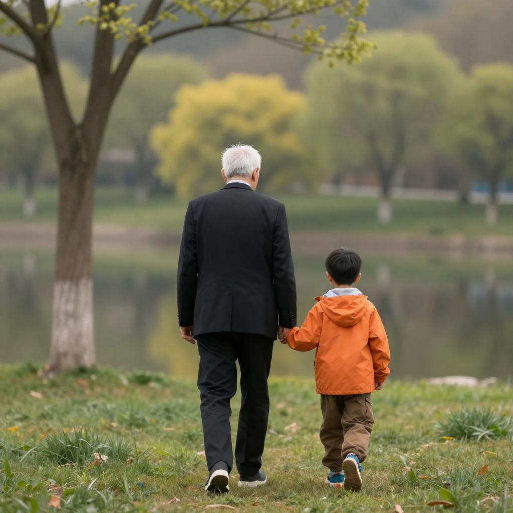 Photograph of a man and a young boy walking down a deserted road with yellow lines. The man, wearing a dark jacket and jeans, carries a brown bag. The boy, in a red helmet, green and black jacket, and neon green pants, holds a blue backpack. Autumn trees and a clear sky form the background.