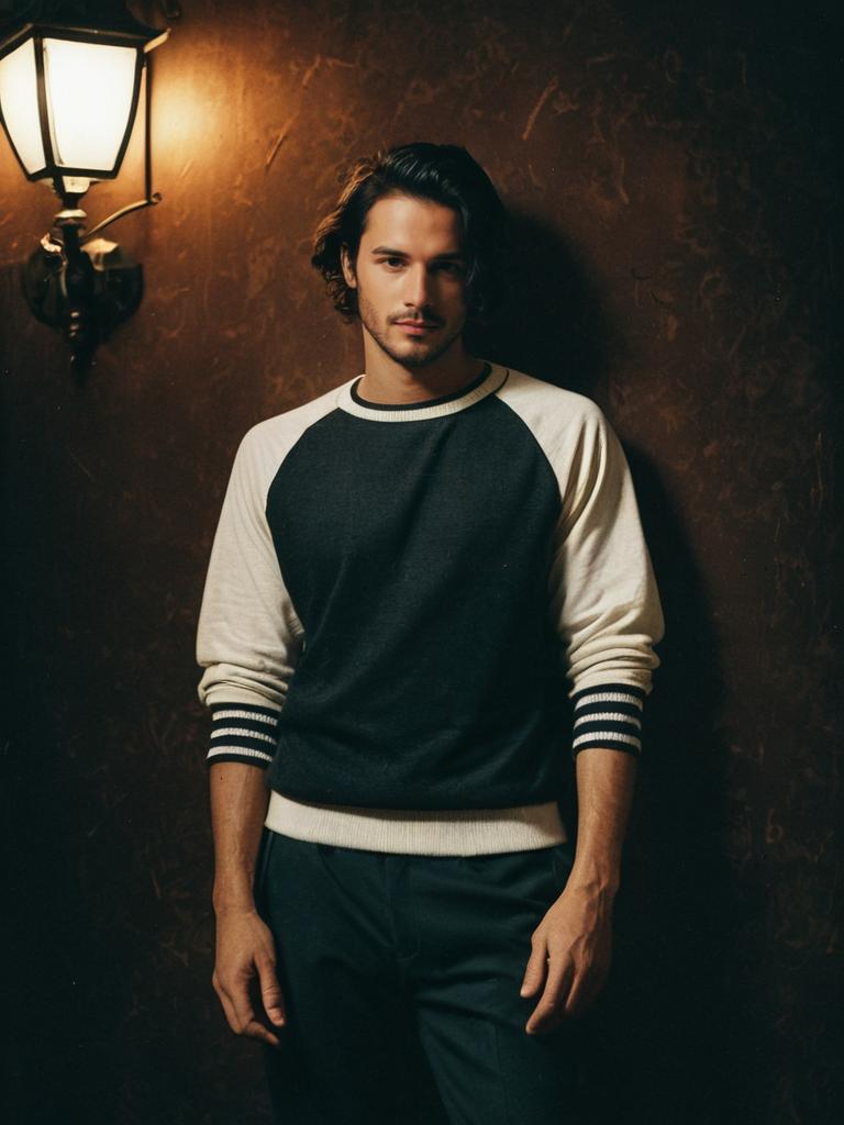 Portrait of a young man with medium-length dark hair wearing a black and white raglan sleeve sweater, standing against a dark textured wall with a vintage wall lamp illuminating the scene.