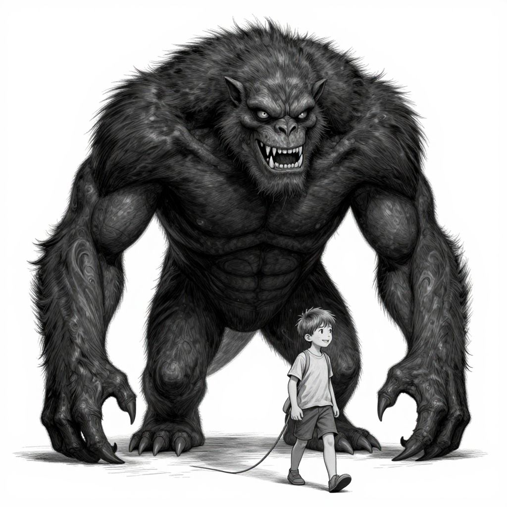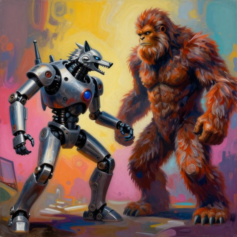Smudges psychedelic painting of a robotic metal machine robot wolf fighting a hairy furry sasquatch Bigfoot covered in thick fur,