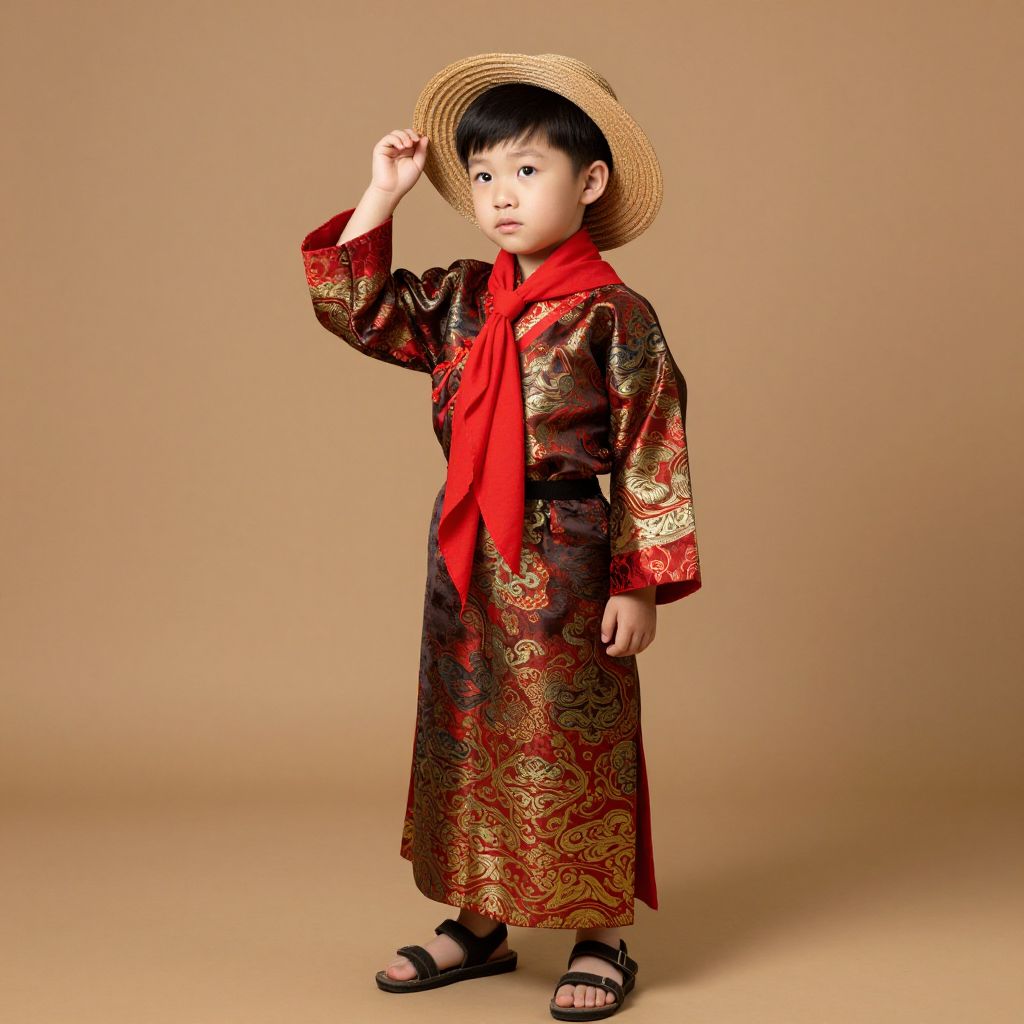 An Asian boy with neat black hair and a straw hat tilted slightly on his head, standing confidently in front of a warm, natural brown background. He wears a traditional Chinese dress adorned with intricate red and gold patterns, featuring a flowing red scarf wrapped around his neck, adding a vibrant touch of cultural elegance. He is dressed in comfortable traditional sandals on his feet, and his expression is calm and curious, as if exploring his surroundings. The scene is softly lit, emphasizing the rich colors and textures of the outfit, with a subtle sense of tradition and quiet charm.