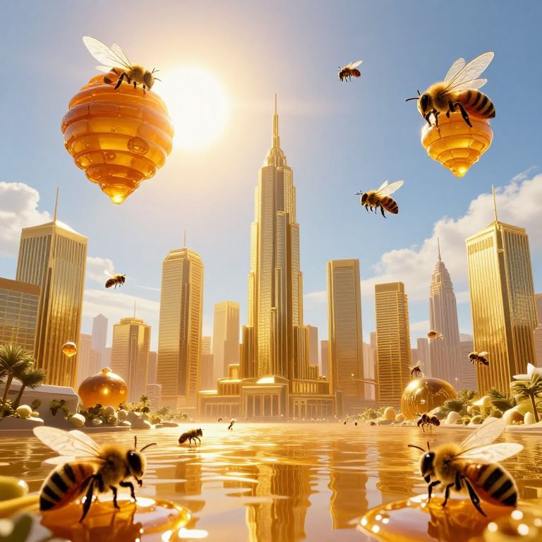 In a surreal dreamscape where golden skyscrapers rise from an ocean of honey, enormous beehives shimmer like celestial bodies under a radiant sun, evoking a paradoxical blend of wonder and unease as bees dance between the realms of nature and industry.