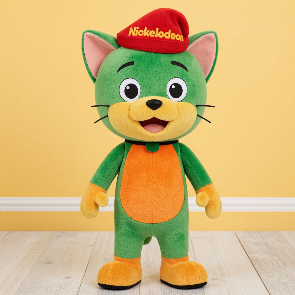 Photorealistic CGI image of a cheerful, cartoon-style plush doll with orange shorts, tan boots, and a yellow shirt, standing in a brightly lit