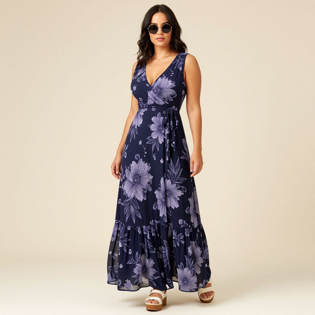 Photograph of a plus-size woman with dark hair, wearing a navy blue floral maxi dress, round sunglasses, and brown sandals, standing against a plain