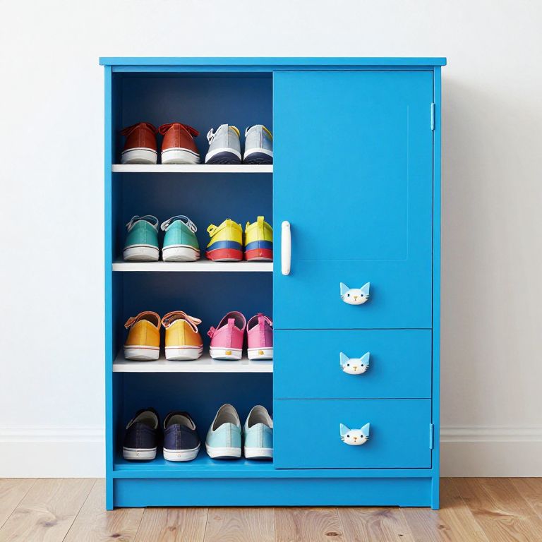 DIY dress-up cabinet repurposed from an old entertainment center features a vibrant blue door with a white handle, four neatly organized shelves holding colorful shoes, and four drawers with playful cat-shaped handles, all set against a clean white wall and wooden floor.