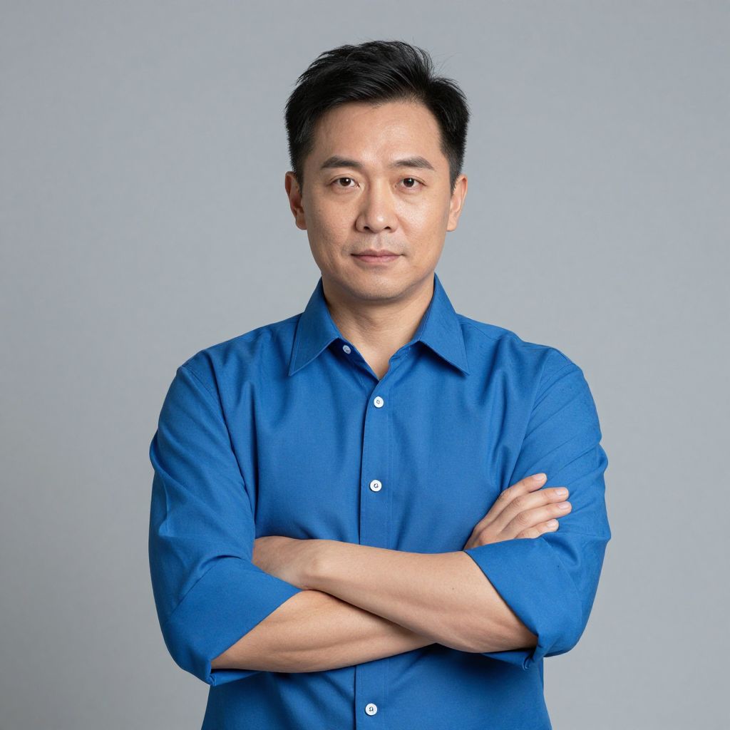 Photograph of an Asian man with short black hair, wearing a bright blue button-up shirt, arms crossed, standing against a light gray background.