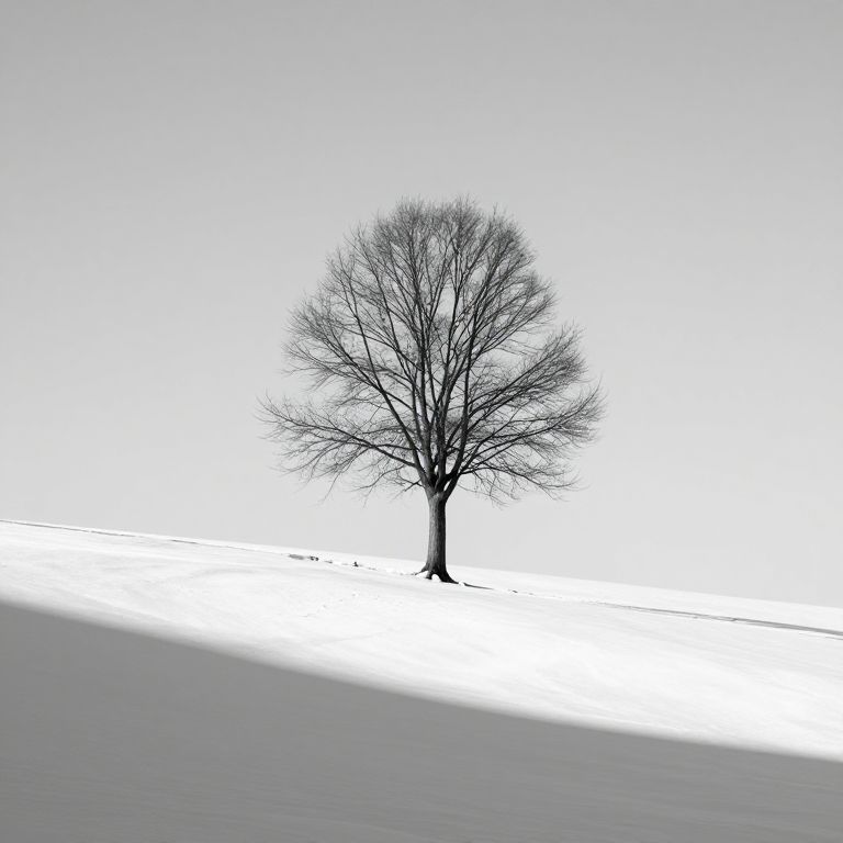 One image featuring a minimalist black and white composition of a single tree on a snowy hill, with sharp contrasts and soft shadows creating a calm, contemplative mood, highlighting simplicity, solitude, and the stark beauty of winter.
