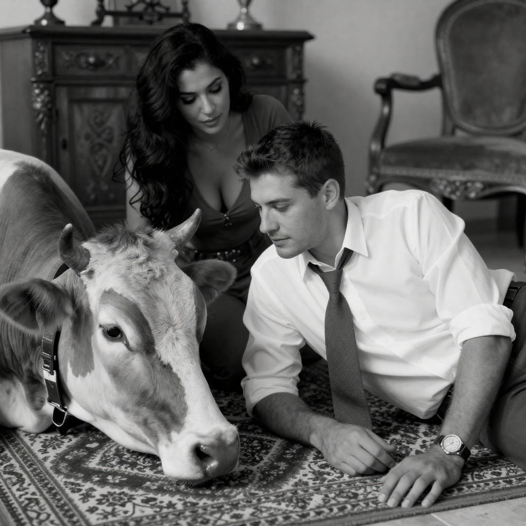 Black-and-white photograph of a man in a white shirt and tie, with short hair, lying on a patterned rug beside a cow. A woman with long dark hair, wearing a low-cut top, leans over the cow, looking at the man. Ornate furniture and a chair are in the background.
