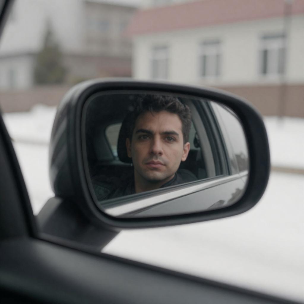 Photograph of a man with short dark hair, wearing a black jacket, white and black striped shirt, and black pants, walking quickly between two white trucks and a silver car in a busy urban parking lot. Background includes industrial buildings and a large circular sign. The man's expression is focused.