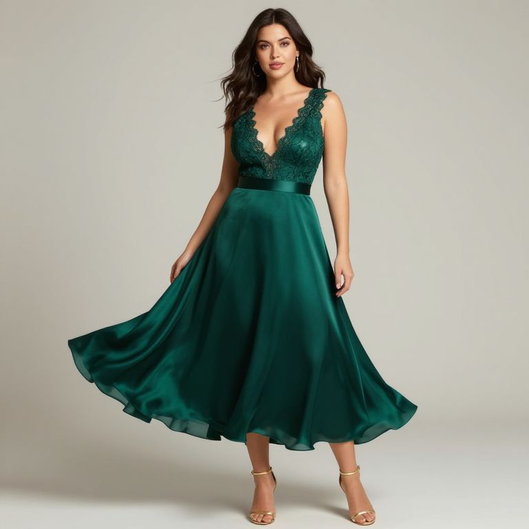 "Plunging neckline, A-line birthday dress, satin fabric, deep emerald green, lace trim, delicate floral embroidery, sleeveless design, flowing skirt, matching satin belt, ankle-strap heels, gold accessories.. Sexy. Pretty face and beаutiful eyes. Big breasts."